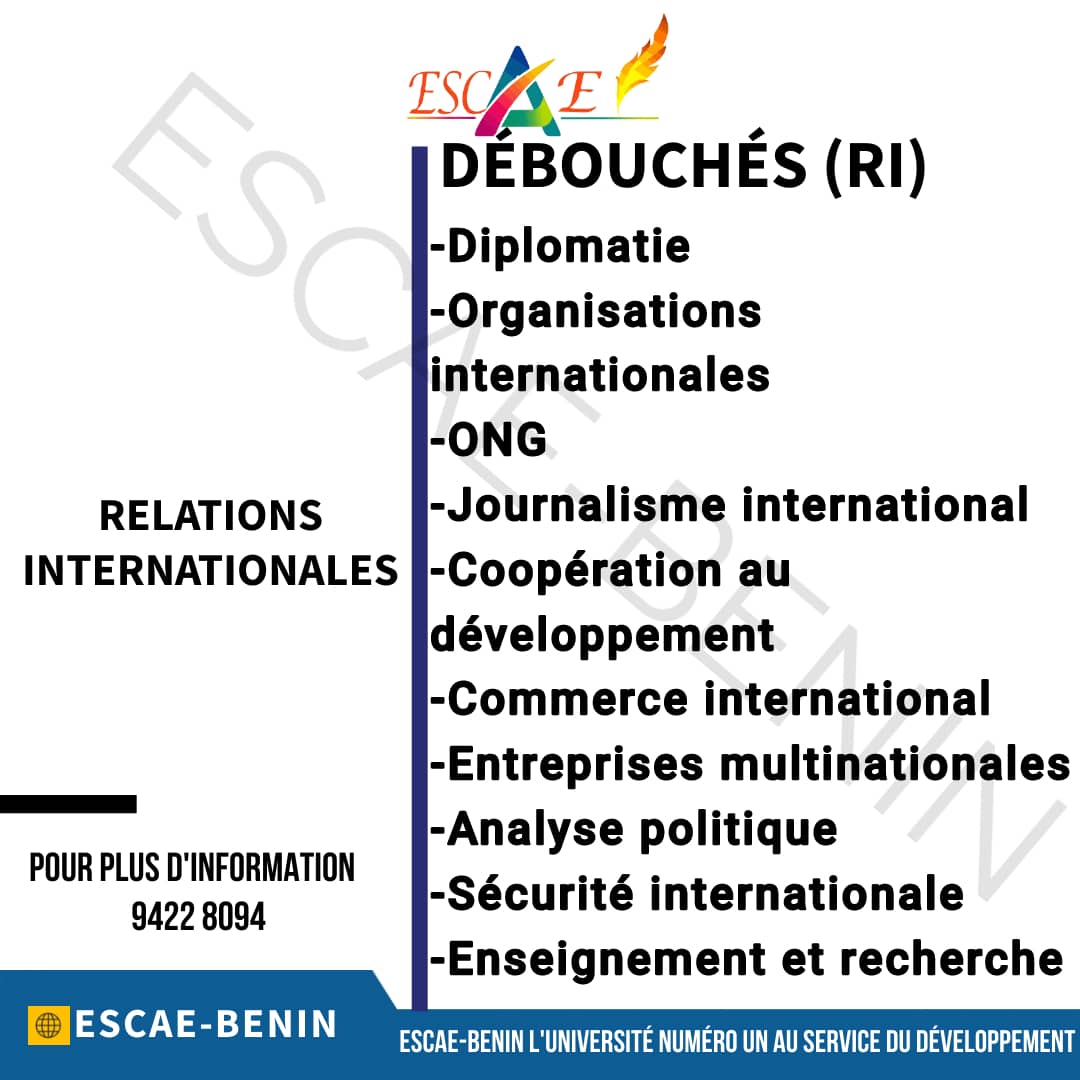La filière Relations Internationales forme des spécialistes capables d’analyser et de gérer les interactions entre les nations, les organisations internationales et les entreprises à l’échelle mondiale. Les étudiants y apprennent les principes du droit international, de la diplomatie, des politiques étrangères, et du commerce international. Ils développent des compétences en négociation, en résolution de conflits et en gestion des crises internationales. Les diplômés peuvent devenir diplomates, analystes en relations internationales, ou travailler pour des organisations internationales comme l’ONU, l’Union européenne, ou encore des ONG internationales.